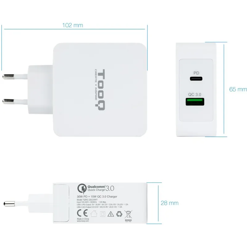 TooQ TQWC-2SC03WT Cargador de Pared Universal USB-A/USB-C 48 W Carga Rápida Blanco