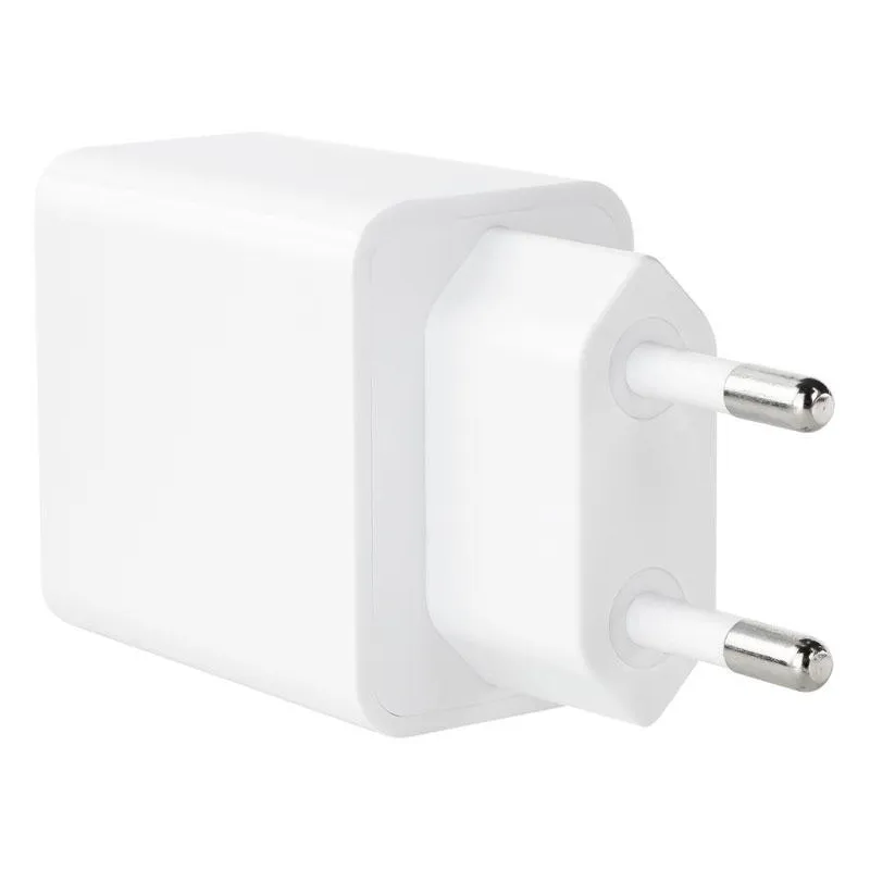Viene en un elegante color blanco que se adapta a cualquier entorno. En términos de control de energía, opera dentro de un rango de voltaje de entrada de 100 - 240 V y una frecuencia de 50 / 60 Hz, con una corriente de entrada de 0.8 A. La potencia máxima de salida es de 20 W, con voltajes de salida variables entre 5 V y 12 V. La salida del puerto 1 es de 18 W y del puerto 2 es de 20 W, con corrientes de salida adaptables a diferentes necesidades de carga.