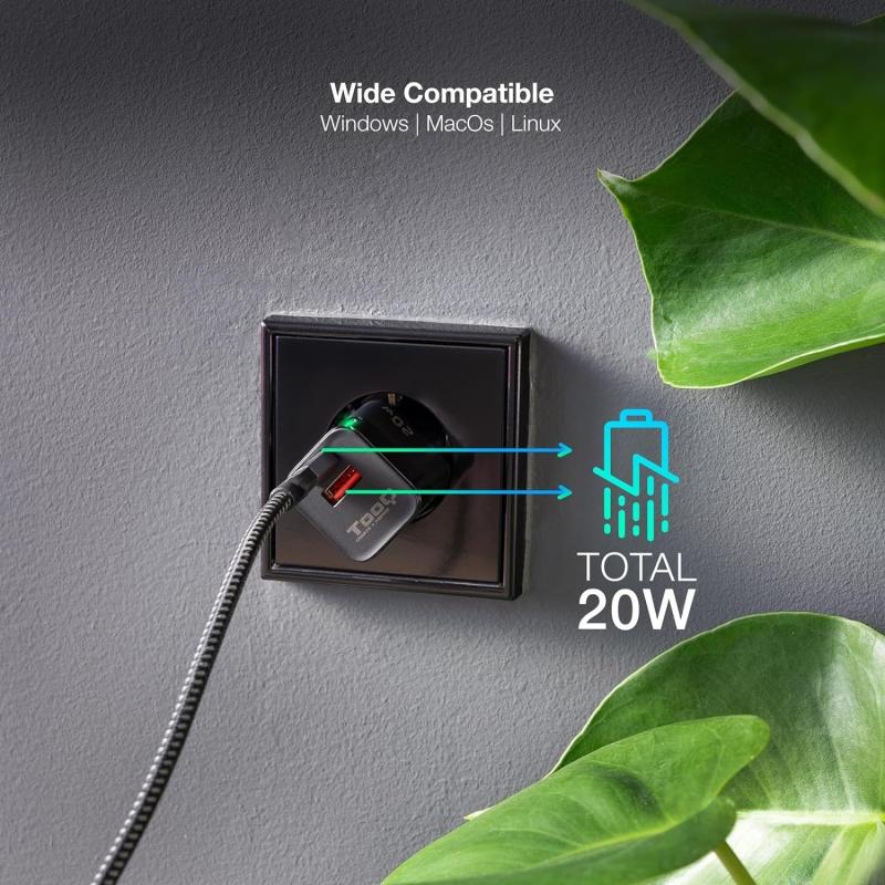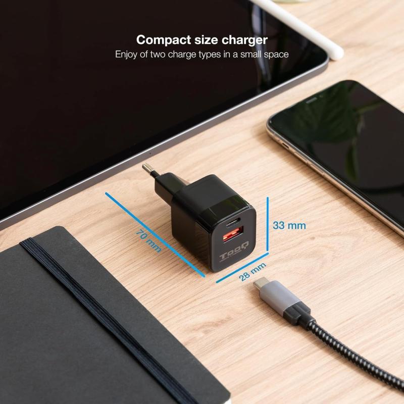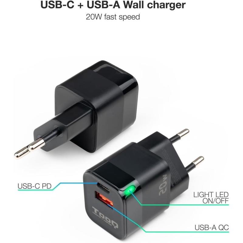 TooQ TQWC-QCPD20 Cargador de Pared 20W USB-C + USB-A Negro