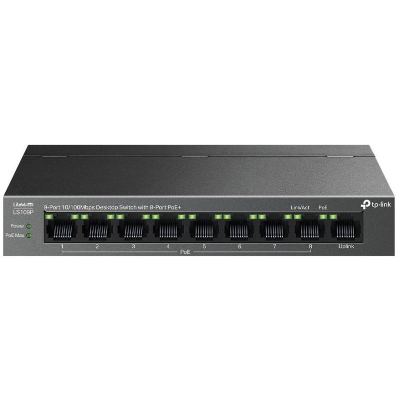 Switch Tp-link Litewave LS109P no administrado con 9 puertos Fast Ethernet 8 PoE+ QoS 1,8 Gbps sin ventilador y montaje en pared, color Negro