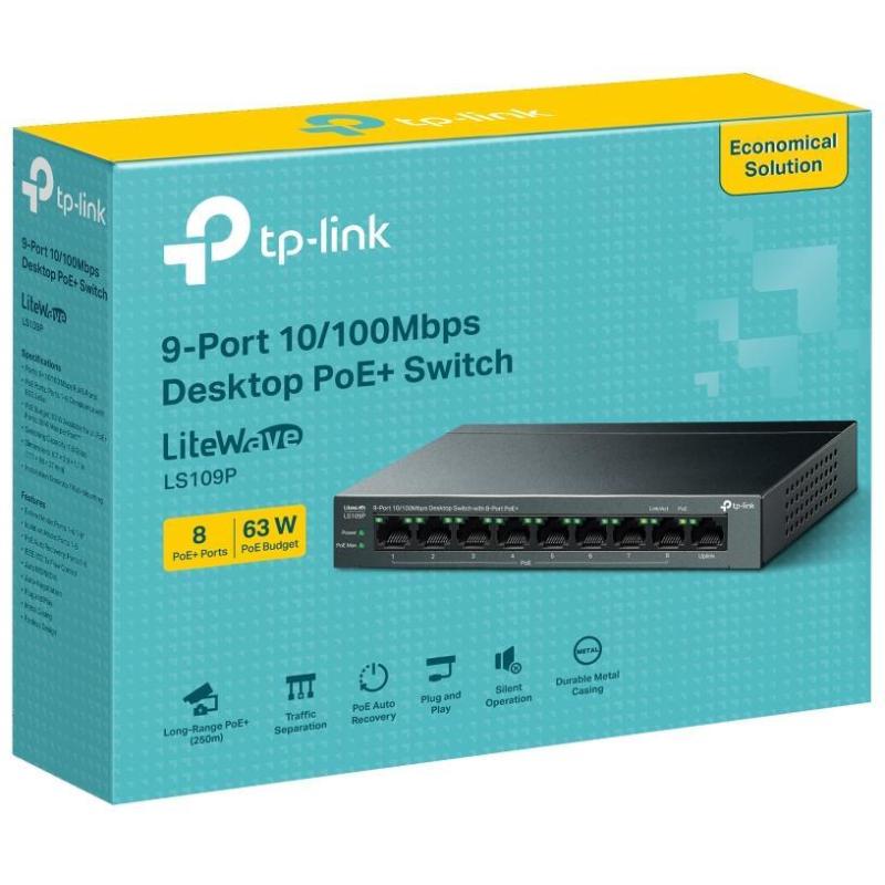 Switch Tp-link Litewave LS109P no administrado con 9 puertos Fast Ethernet 8 PoE+ QoS 1,8 Gbps sin ventilador y montaje en pared