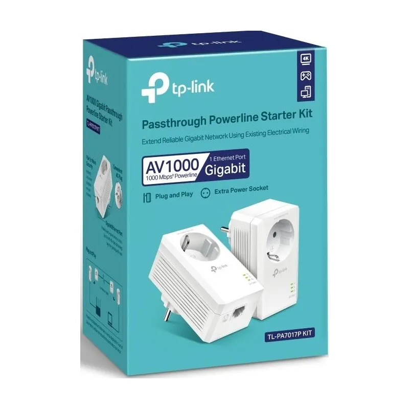 TOMA DE CORRIENTE EXTRA PARA DISPOSITIVOS ADICIONALES: ¿Te resulta difícil enchufar tus dispositivos? El TL-PA7017P KIT tiene una toma de corriente AC integrada. Tu adaptador powerline ahora puede ser usado como una toma de corriente tradicional. Enchufa tu televisor inteligente o consolas de juegos en el adaptador. Ninguna toma de corriente se desperdicia.