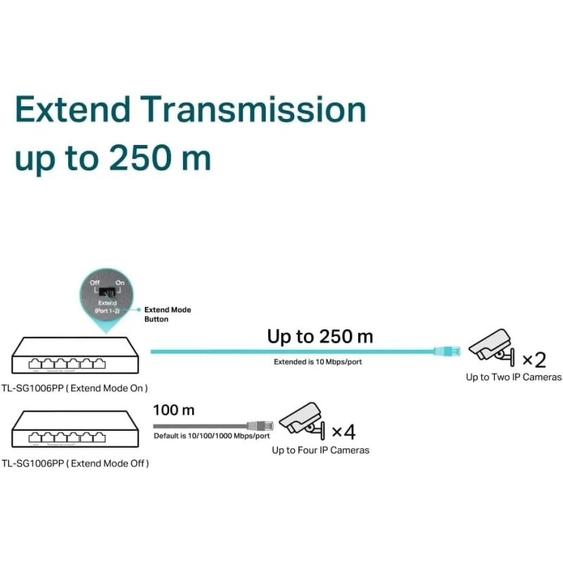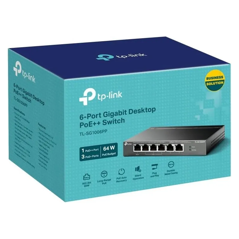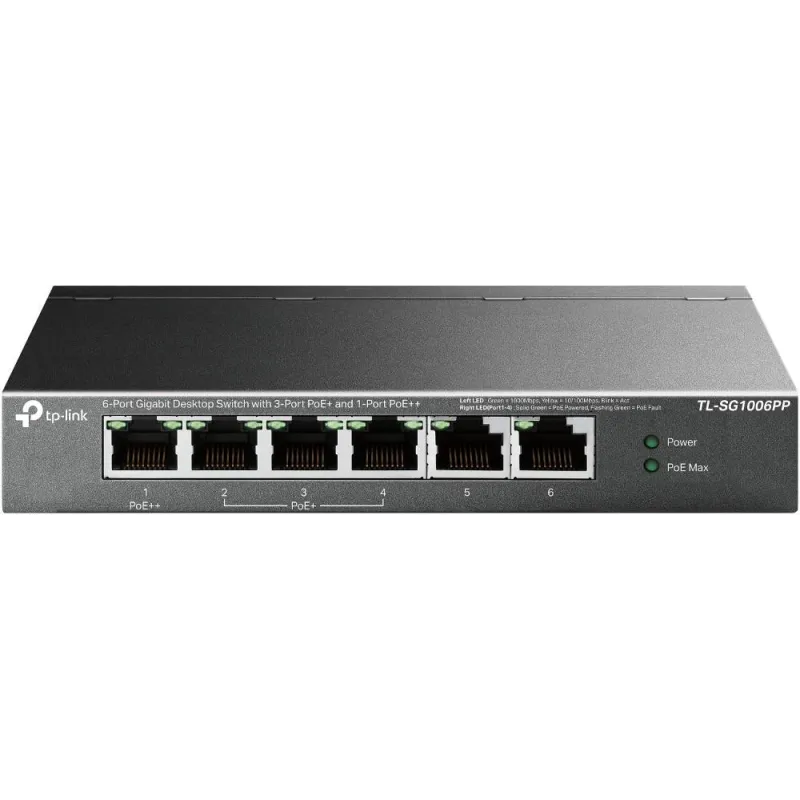 TL-SG1006PP ES UN SWITCH NO GESTIONADO CON 6 PUERTOS GIGABIT QUE NO REQUIERE CONFIGURACIÓN Y PROPORCIONA: 4 puertos PoE (Power over Ethernet). Puede detectar y suministrar automáticamente energía a todos los dispositivos alimentados (PDs) compatibles con IEEE 802.3af/at/bt en el puerto 1 y dispositivos alimentados (PDs) compatibles con IEEE 802.3af/at en los puertos 2-4. En esta situación, la energía eléctrica se transmite junto con los datos en un solo cable, lo que le permite expandir su red a lugares donde no hay líneas eléctricas ni tomas de corriente, donde desea instalar dispositivos como APs, cámaras IP o teléfonos IP, etc.