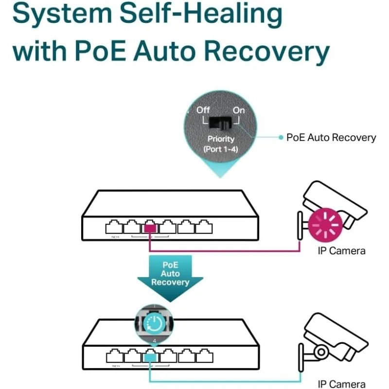 - La Recuperación Automática PoE garantiza el funcionamiento estable de los dispositivos PoE al reiniciar automáticamente los dispositivos PD desconectados o no responsivos