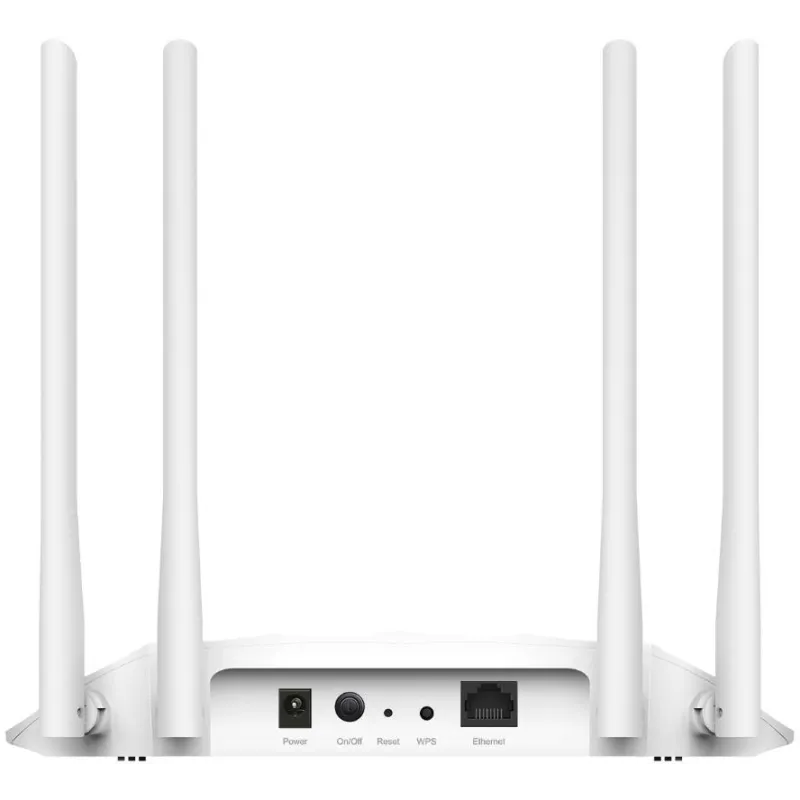 Cuenta con un puerto Ethernet LAN (RJ-45) y es compatible con PoE activo, con un voltaje de salida de 12 V y una corriente de salida de 1,5 A. Su diseño blanco elegante incluye un interruptor de encendido/apagado integrado, un botón de restaurar y seguridad WPS, y utiliza 4 antenas externas para maximizar la cobertura.