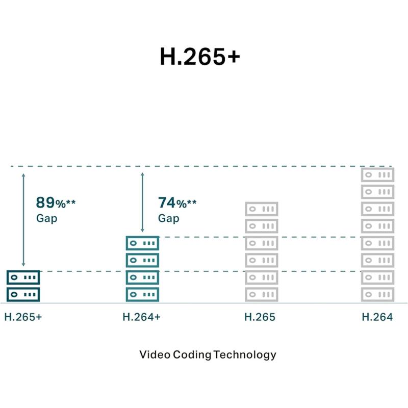 - H.265+: ahorra espacio de almacenamiento y ancho de banda sin sacrificar la calidad de imagen de los vídeos. Con ello puedes ahorrar en costes de monitorización.