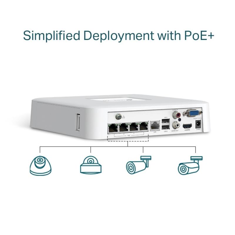 4 PUERTOS POE+ DEDICADOS (PRESUPUESTO DE 53 W) PARA UNA IMPLEMENTACIÓN SIMPLIFICADA DE LA CÁMARA IP: Cuenta con 4 puertos PoE+ de 10/100 Mbps, el NVR admite hasta 30 W en cada puerto PoE+. Diseñado para utilizar un único cable Ethernet para transmisión de datos y energía, ofrece una instalación flexible que se adapta a diversos escenarios de vigilancia para pequeñas empresas, como tiendas de comestibles, almacenes, restaurantes e instituciones financieras.