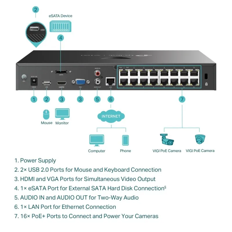 El VIGI Network Video Recorder ofrece una experiencia superior en vídeo y audio con una entrada de vídeo IP de 16 canales y un ancho de banda entrante de 80 Mbps, acompañado de un ancho de banda saliente de 60 Mbps. Su resolución de salida HDMI es impresionante, con un canal que soporta hasta 3840x2160/30Hz, y también ofrece salida VGA con múltiples resoluciones como 1920x1080/60Hz. Además, permite una visualización multivista de hasta 16 canales, y la salida simultánea HDMI/VGA.