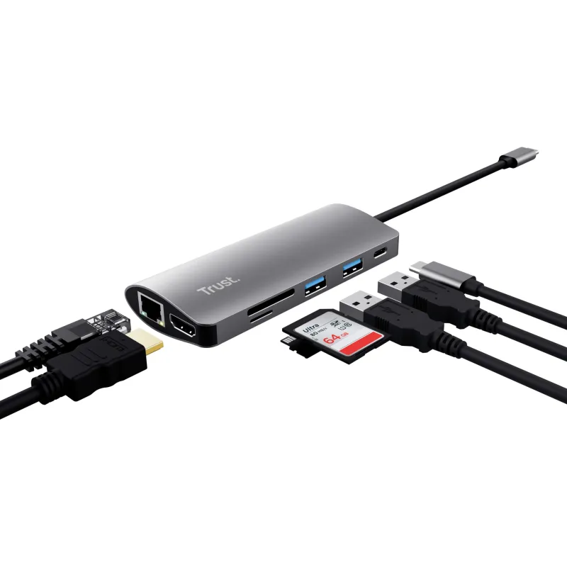 CONECTIVIDAD ES IGUAL A PRODUCTIVIDAD: Los portátiles delgados son geniales, pero su falta de puertos de conexión puede ser un problema. Bueno, hasta ahora. Con el adaptador 7 en 1 Dalyx de Trust, la productividad se multiplica por siete gracias a las conexiones HDMI, Ethernet, USB, USB-C y para tarjetas de memoria.