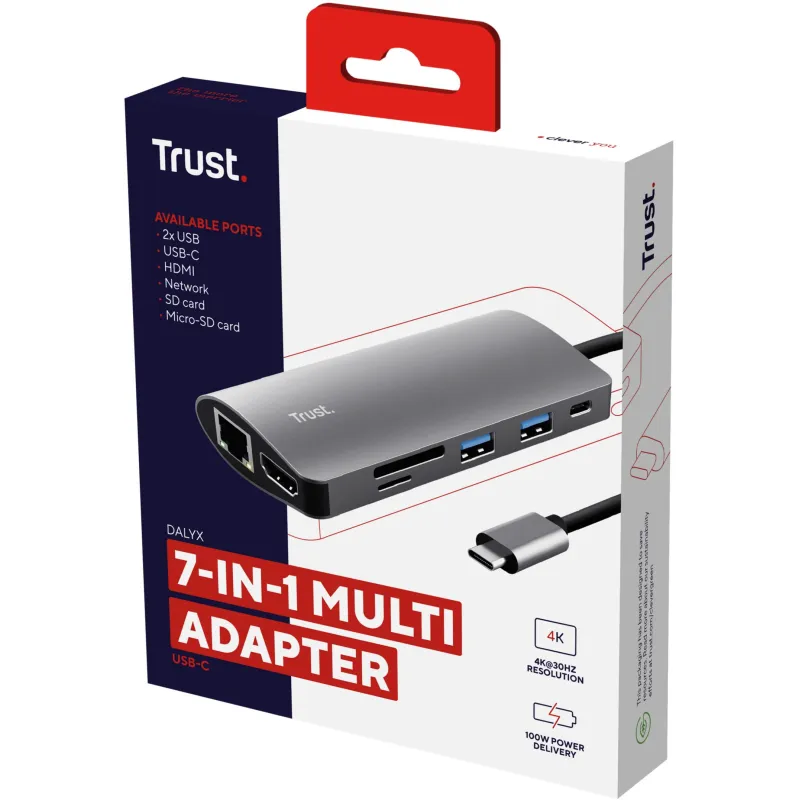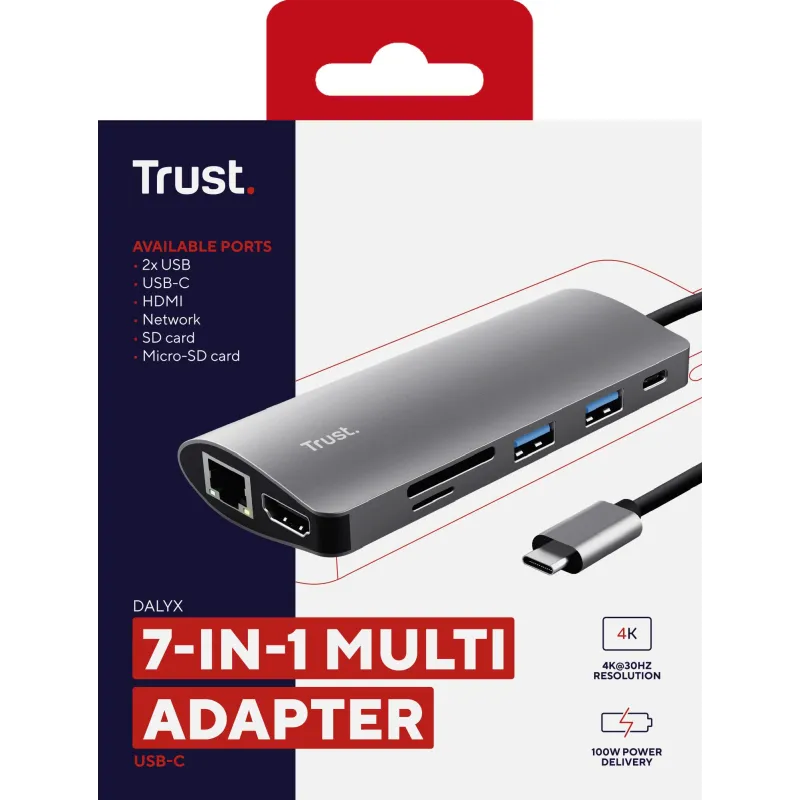 SIEMPRE EN MARCHA: Si está constantemente en movimiento, el adaptador 7 en 1 Dalyx de Trust será su mejor aliado. Su reducido factor de forma se suma a una robusta carcasa de aluminio, por lo que se puede llevar a cualquier lugar. No es necesaria una fuente de alimentación adicional. Cuando salga a hacer fotos o incluso de vacaciones, el lector de tarjetas incluido garantiza la copia de seguridad de las fotografías de manera muy fácil.