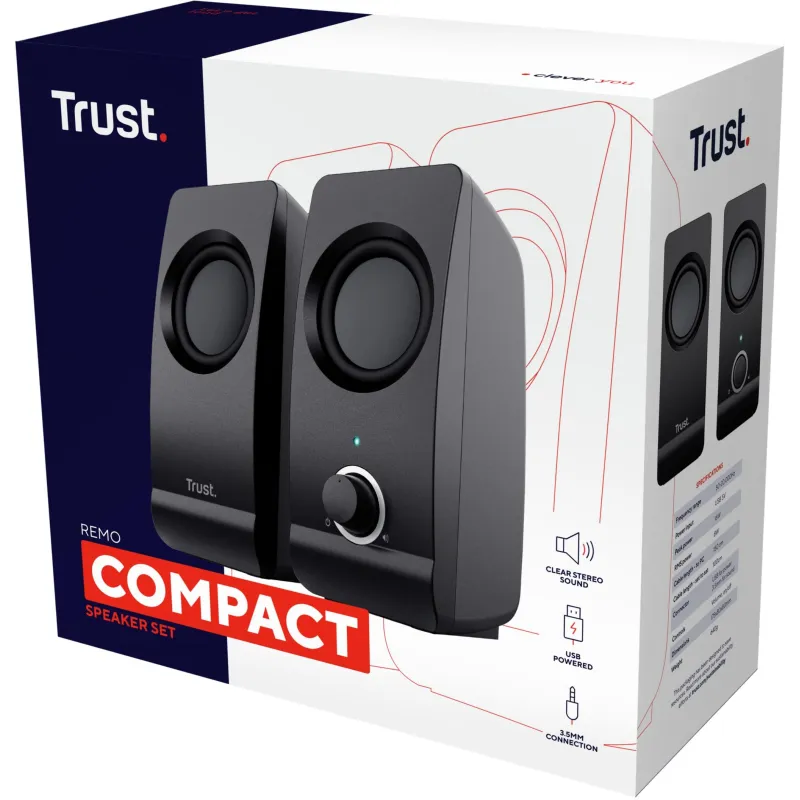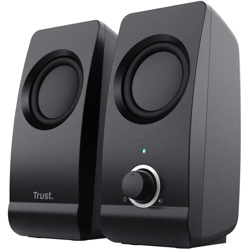 SONIDO COMPACTO: El juego de altavoces Remo 2.0 de Trust es un elegante complemento para tu PC u ordenador portátil que mejora el sonido. Conecta y disfruta de un sonido definido y rico en matices en casa, la oficina o cualquier otro lugar.