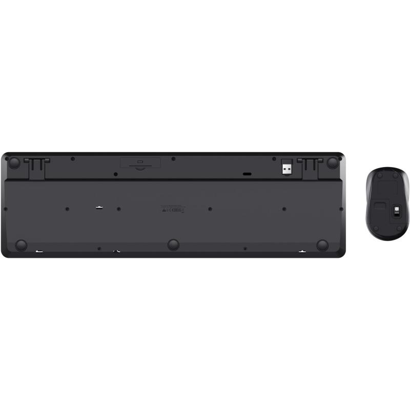 El conjunto incluye un ratón óptico ambidiestro con resolución de 1600 DPI, botones presionados y una rueda de desplazamiento vertical. El ratón utiliza una batería AA y también cuenta con un interruptor de encendido/apagado. Ambos dispositivos son compatibles con Windows 10, Windows 11, Mac OS X y ChromeOS.