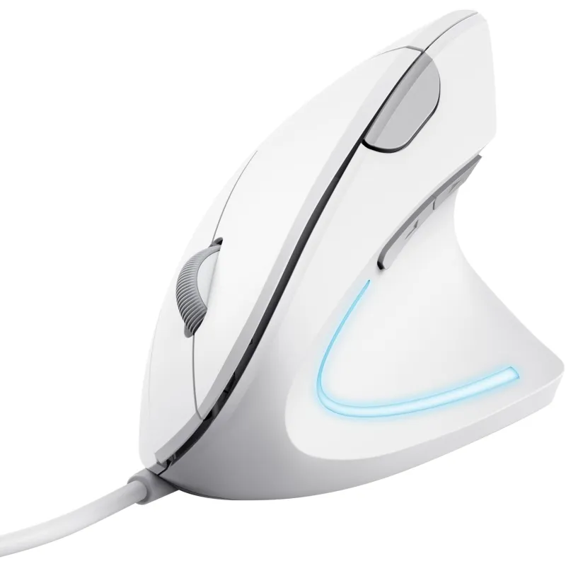 El diseño vertical y ergonómico para mano derecha está construido con acrilonitrilo butadieno estireno (ABS) en color blanco, proporcionando comodidad y soporte para el pulgar durante largas sesiones de uso. Incluye iluminación de color azul, lo que mejora el aspecto estético y facilita su uso en entornos con poca luz.