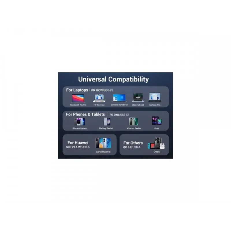 El Cargador de Móvil Ugreen 35025 ha sido diseñado para ofrecer una compatibilidad completa con una amplia gama de dispositivos, incluyendo auriculares, teléfonos móviles, ordenadores portátiles y baterías externas. Esta versatilidad lo convierte en el compañero perfecto para viajes, ya que permite mantener todos tus dispositivos cargados sin importar el tipo. Gracias a su alimentación encendedor de cigarrillos, se conecta fácilmente en cualquier vehículo, garantizando una carga constante y fiable. Su entrega de energía USB 100 W permite una carga ultra rápida, incluso para dispositivos que requieren alto consumo energético, como portátiles. Es ideal para usuarios que necesitan eficiencia y compatibilidad en un solo dispositivo.