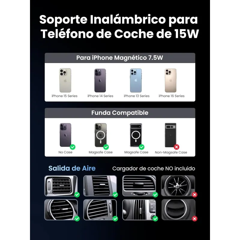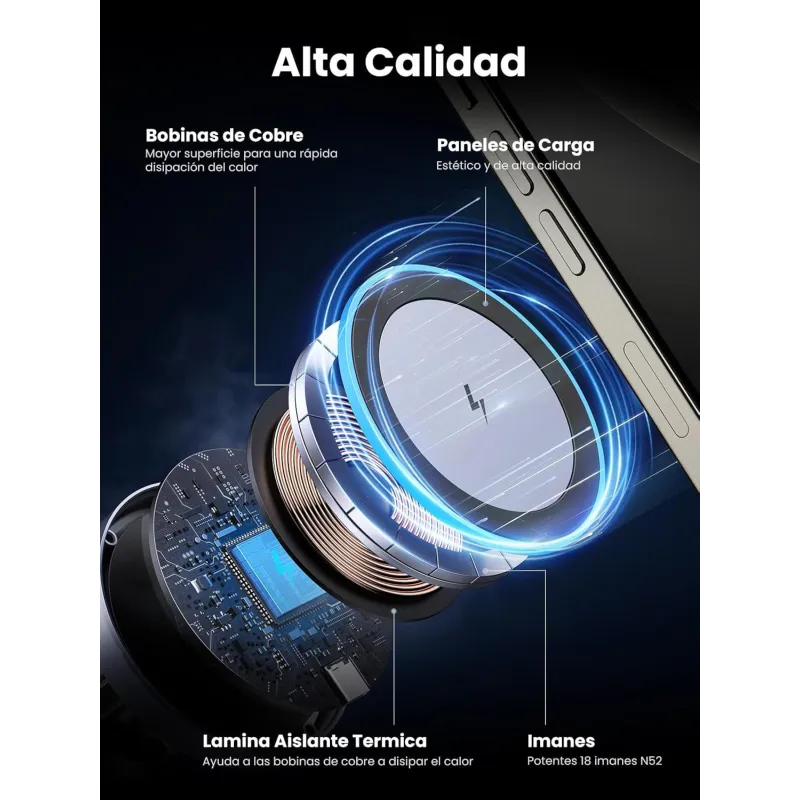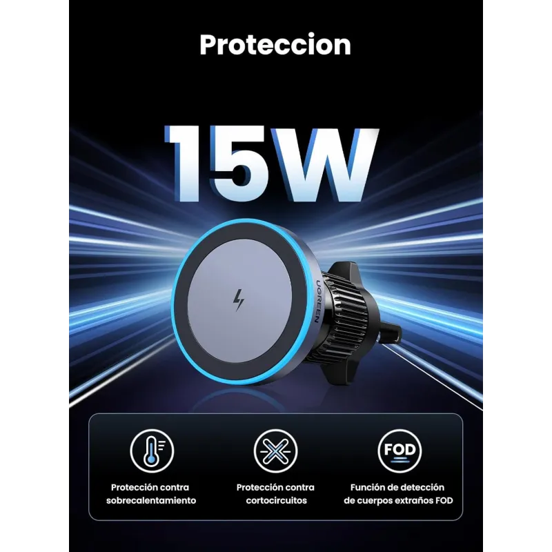 El Cargador de Móvil Ugreen 55959 MagFlow ofrece una potencia máxima 25 W que garantiza una carga rápida y estable, incluso cuando el smartphone está en uso. Esta característica lo diferencia de otros modelos estándar, proporcionando una experiencia de carga más eficiente. Su entrada de 12 V lo hace compatible con la mayoría de vehículos, y su alimentación USB permite una conexión sencilla y directa. Además, al ser un cargador inalámbrico, mantiene la comodidad del usuario al eliminar cables innecesarios. Este cargador es ideal para quienes necesitan mantener su móvil operativo durante todo el trayecto sin perder tiempo en cargas lentas.