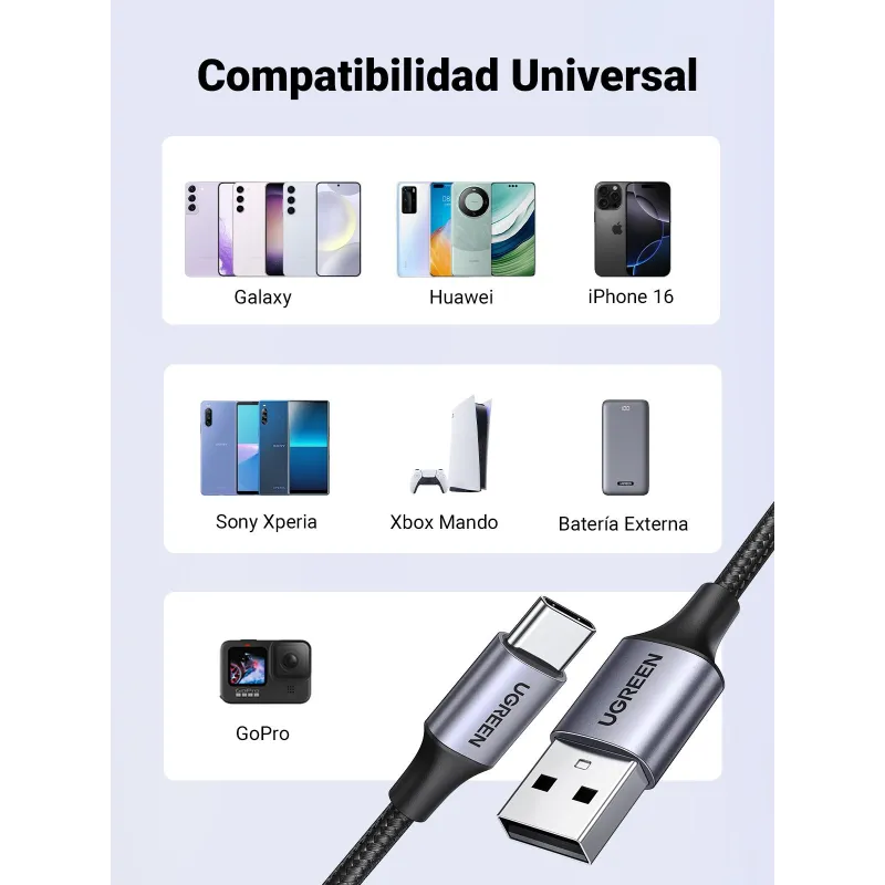 El Cable USB Ugreen 60126 es compatible con una extensa gama de dispositivos, incluyendo modelos recientes de Samsung Galaxy, LG, Motorola, Huawei, Xiaomi y más. También es apto para tablets como el iPad Pro de 2018 y consolas como la Nintendo Switch. Esta versatilidad lo hace ideal para hogares o entornos donde se utilizan múltiples dispositivos con diferentes conectores. La transferencia de datos de 480 Mbit/s y la longitud de cable de 1 metro aseguran una experiencia de uso equilibrada entre rendimiento y comodidad. Su diseño universal y capacidad de carga rápida lo convierten en una solución práctica para cualquier usuario que busque un cable fiable y duradero.