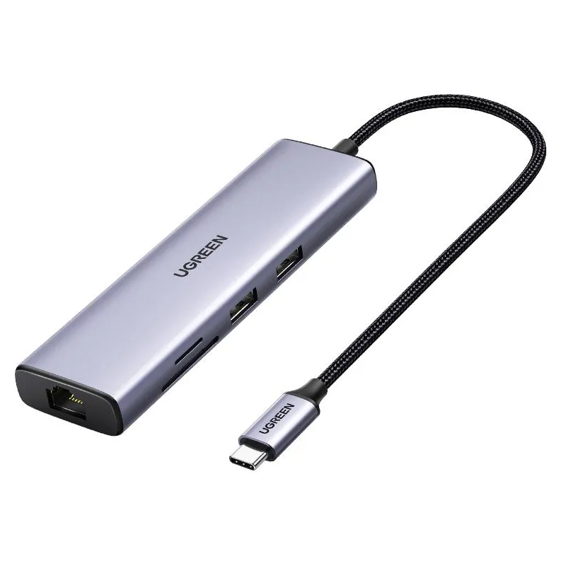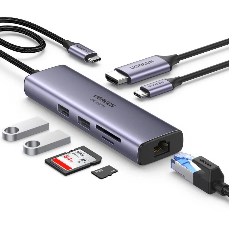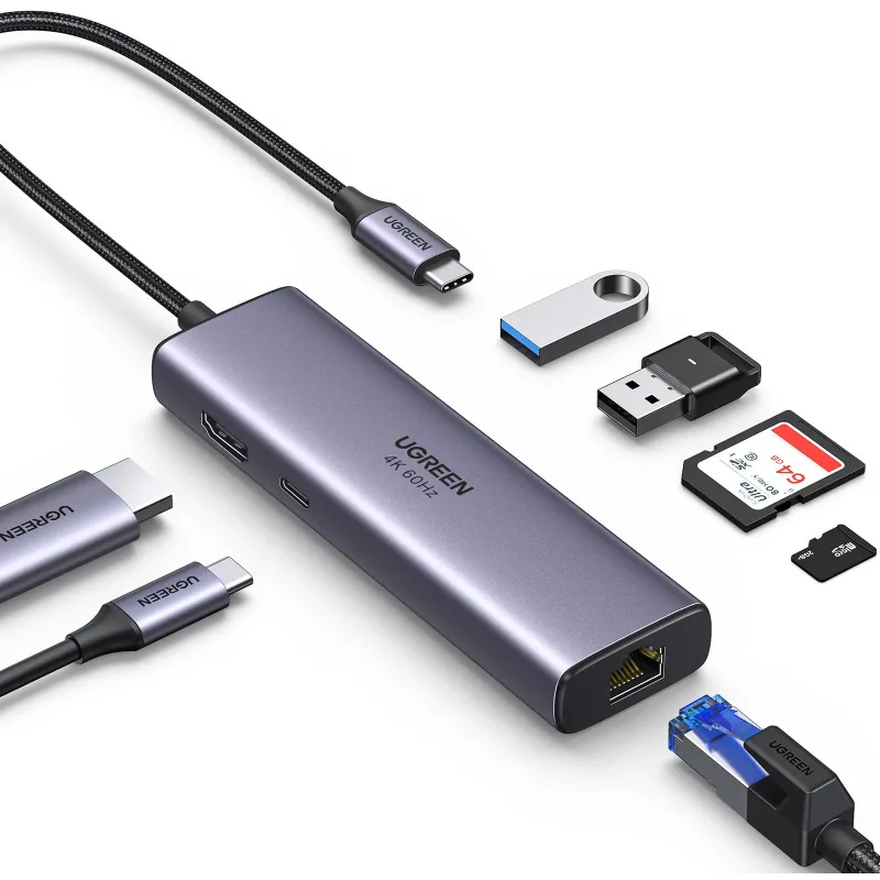 Si trabajas con un portátil o tablet con USB-C y quieres más conexiones en un solo cable, el Ugreen 60515 reúne HDMI, Ethernet RJ-45, USB-A y lector SD, manteniendo la conexión al equipo por USB 3.2 Gen 1 (Type-C).