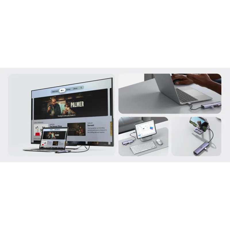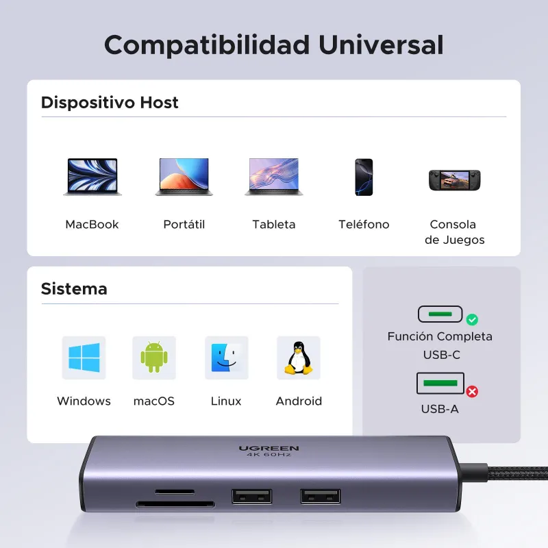 Cuando tu equipo solo tiene USB-C, un dock compacto puede marcar la diferencia en el día a día: el Ugreen 60515 conecta por USB 3.2 Gen 1 (Type-C) y concentra HDMI, Ethernet, USB-A y lector SD en una sola pieza.
