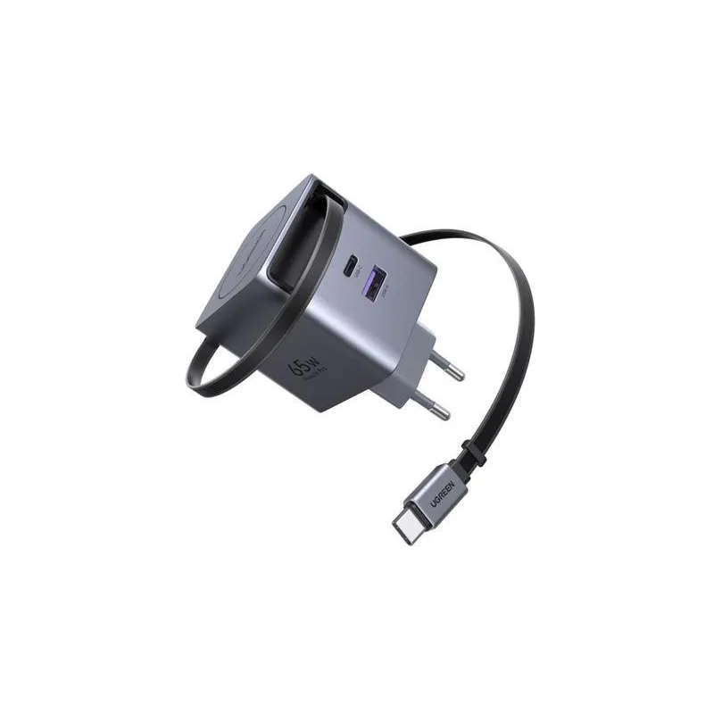 Cargador Rápido Gan 45W UGREEN 65822 con cable USB-C retráctil, doble puerto USB-C y USB-A y carga rápida para móviles, tablets y portátiles.