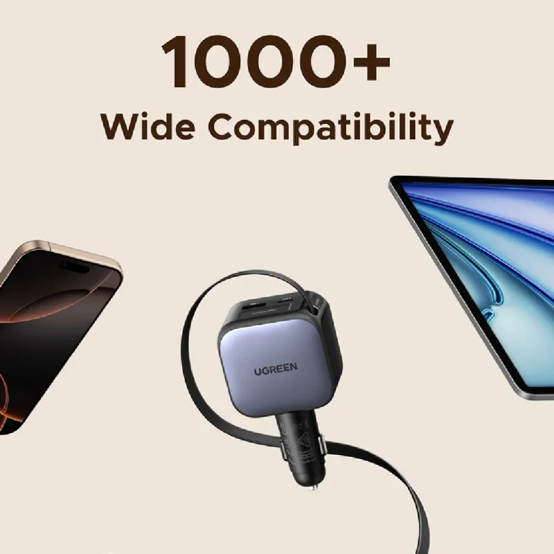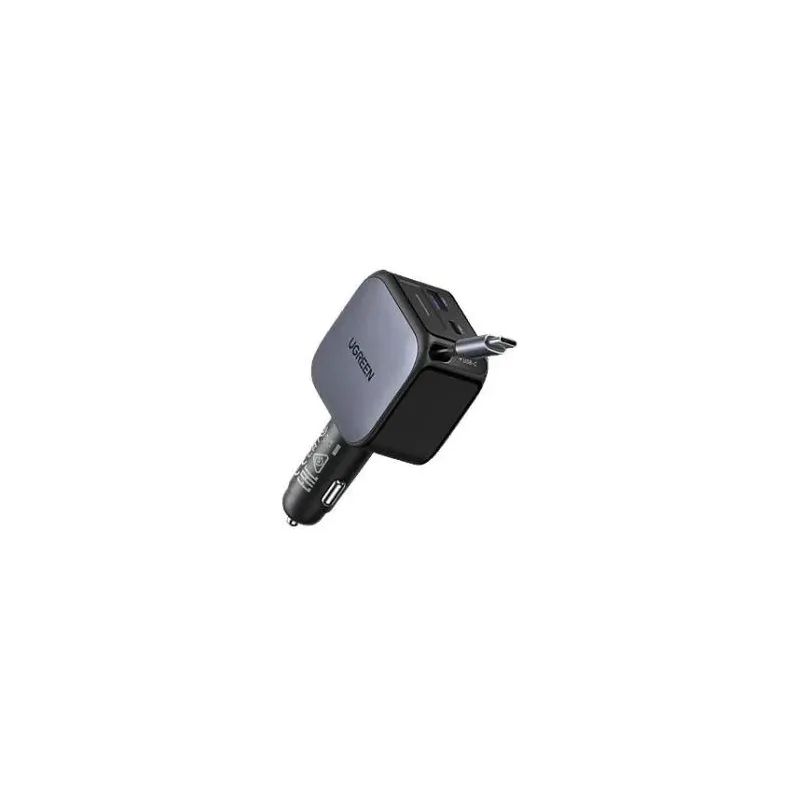 Cargador de Coche UGREEN EC602 de 60W  , con cable USB-C retráctil, tres puertos y carga rápida para móviles, tablets y otros dispositivos en tus trayectos.