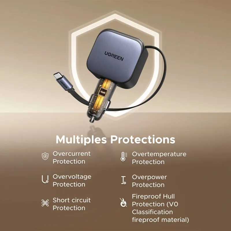 UGREEN EC602 de 60W Cargador de Coche tipo C + USB con Cable Retráctil