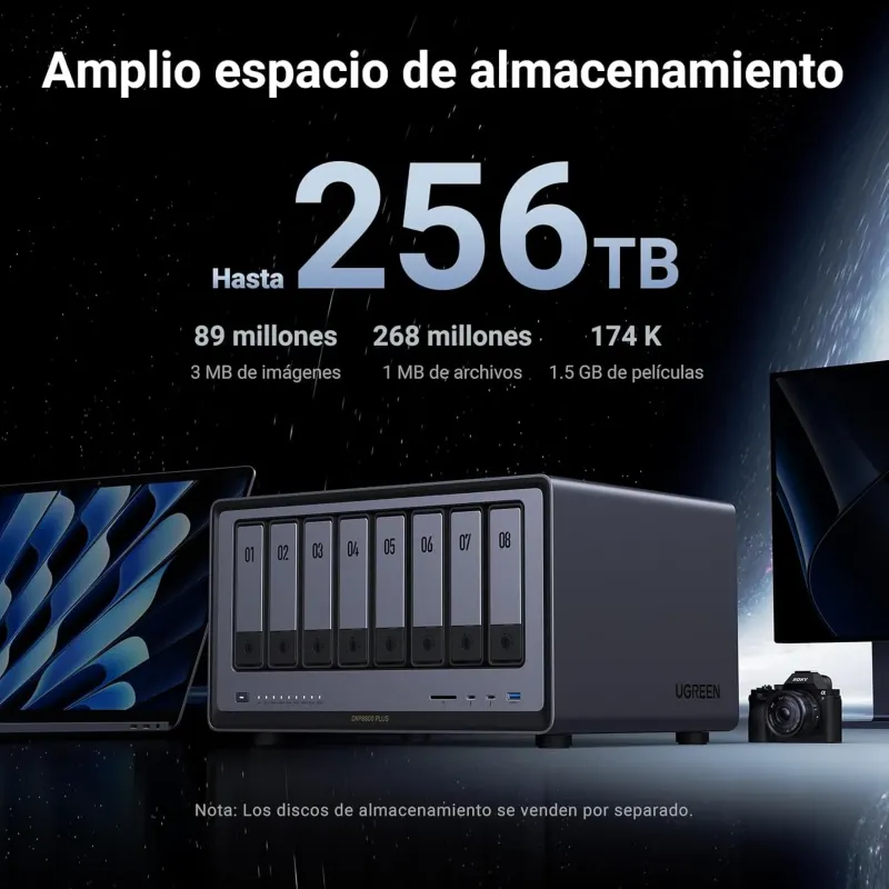 El UGREEN NASync DXP8800 Plus es un NAS de escritorio con 8 bahías pensado para centralizar copias, proyectos y biblioteca multimedia cuando ya te frena la red o el número de discos.