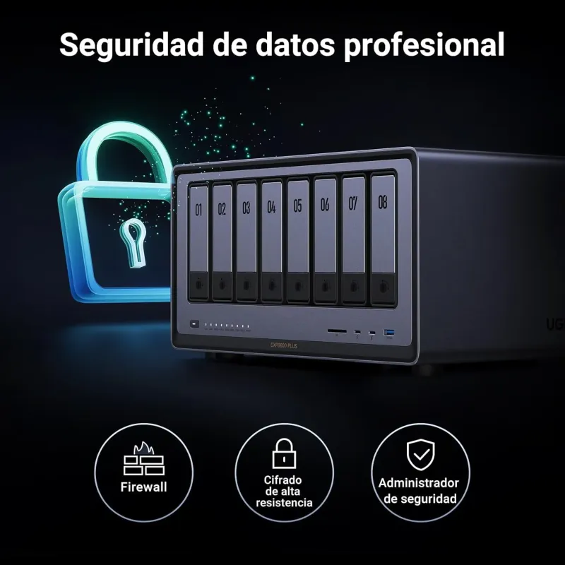 En almacenamiento, combina 8 bahías SATA (2,5" y 3,5") con 2 ranuras M.2 NVMe 2280. Esa mezcla da juego: puedes usar SSD como caché para mejorar respuesta en accesos aleatorios (catálogos, miniaturas, proyectos con miles de archivos) o reservar SSD para un volumen rápido según el uso que le des en UGOS Pro.
