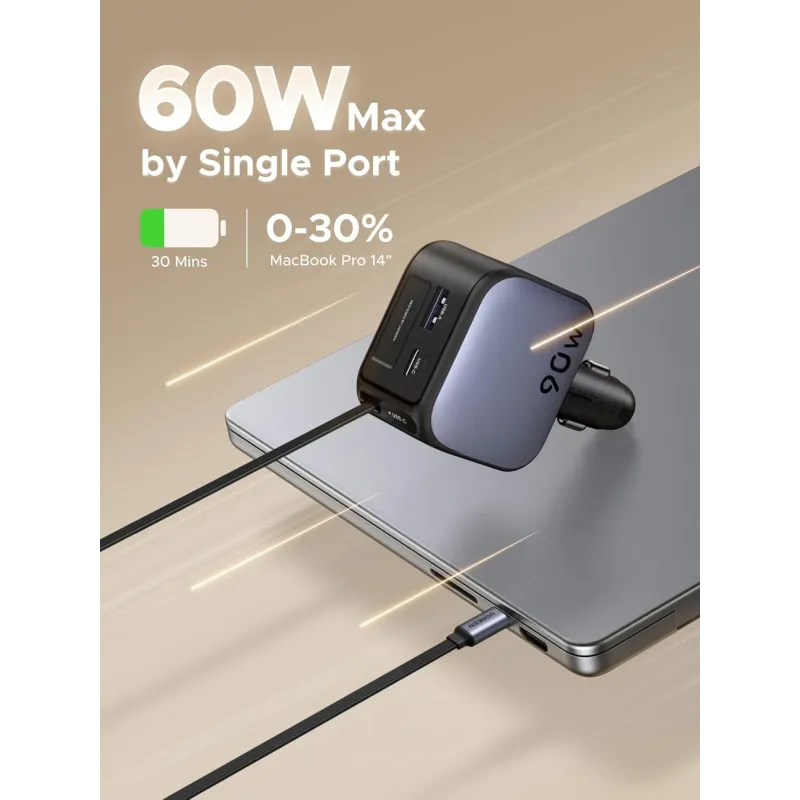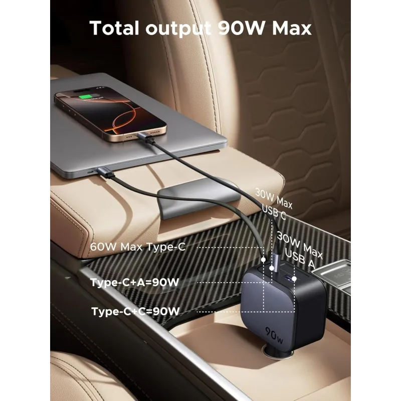 Por qué elegirlo: 1) cable USB-C retráctil (0,7 m) para evitar enredos; 2) hasta 90 W totales para carga compartida; 3) hasta 60 W por el cable USB-C para dispositivos exigentes; 4) compatibilidad con PD3.0, PPS y QC (según salida).