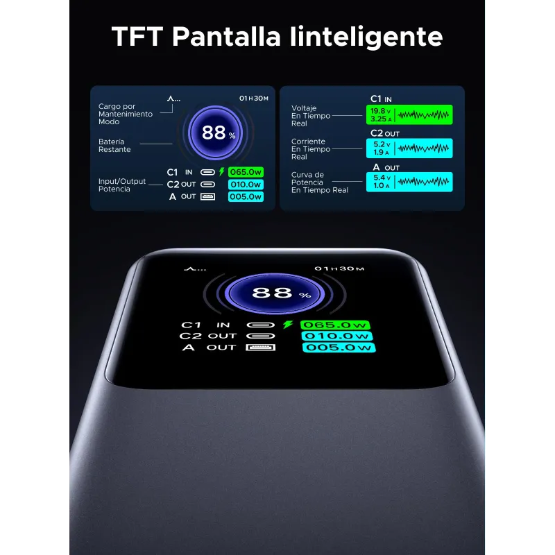• Te ayuda controlar el estado de carga con pantalla TFT mientras alimentas varios dispositivos.