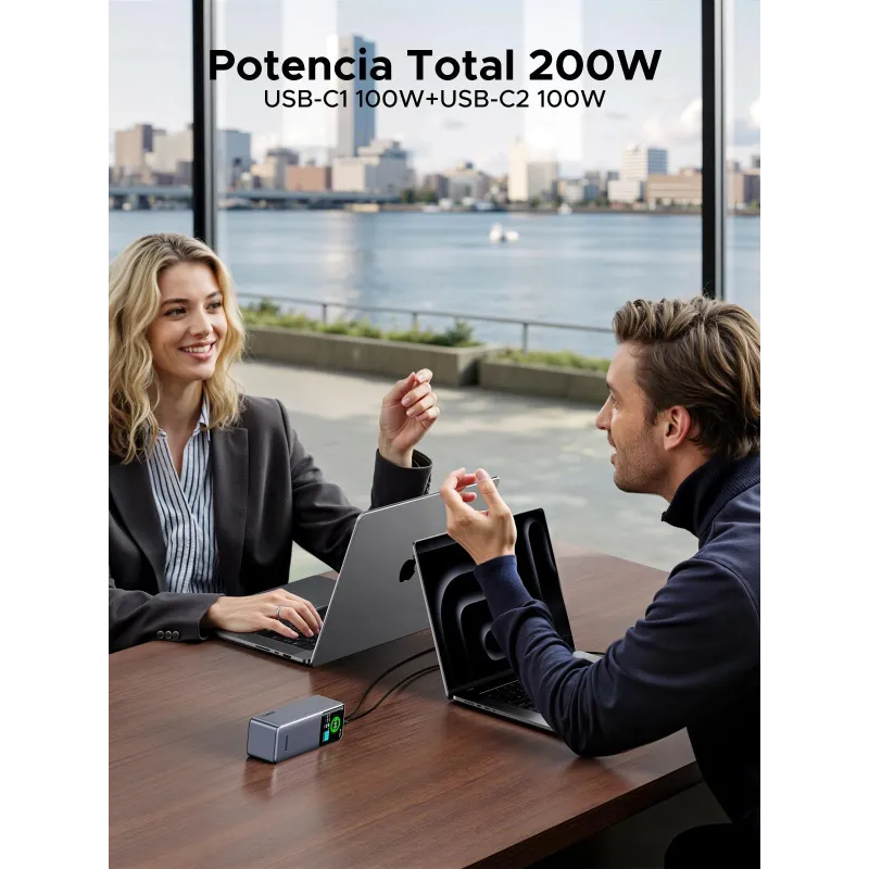 La potencia total de hasta 200 W sirve para escenarios de trabajo móvil donde se cargan varios equipos sin parar. Con dos USB-C para repartir energía y un tercer dispositivo adicional, es una solución práctica en cafeterías, salas de reuniones o bibliotecas donde los enchufes van caros.
