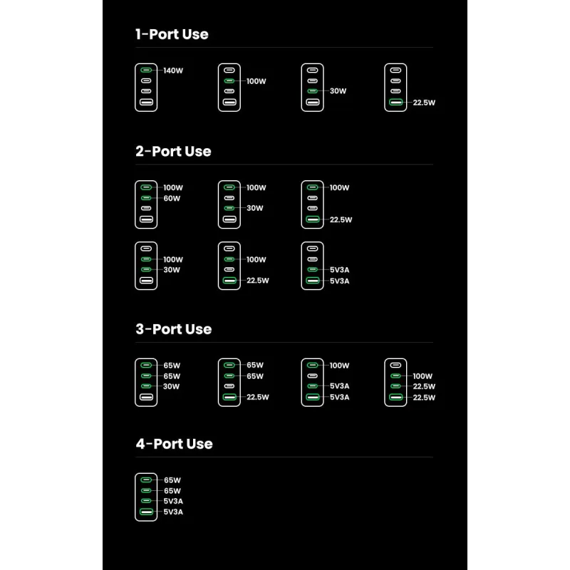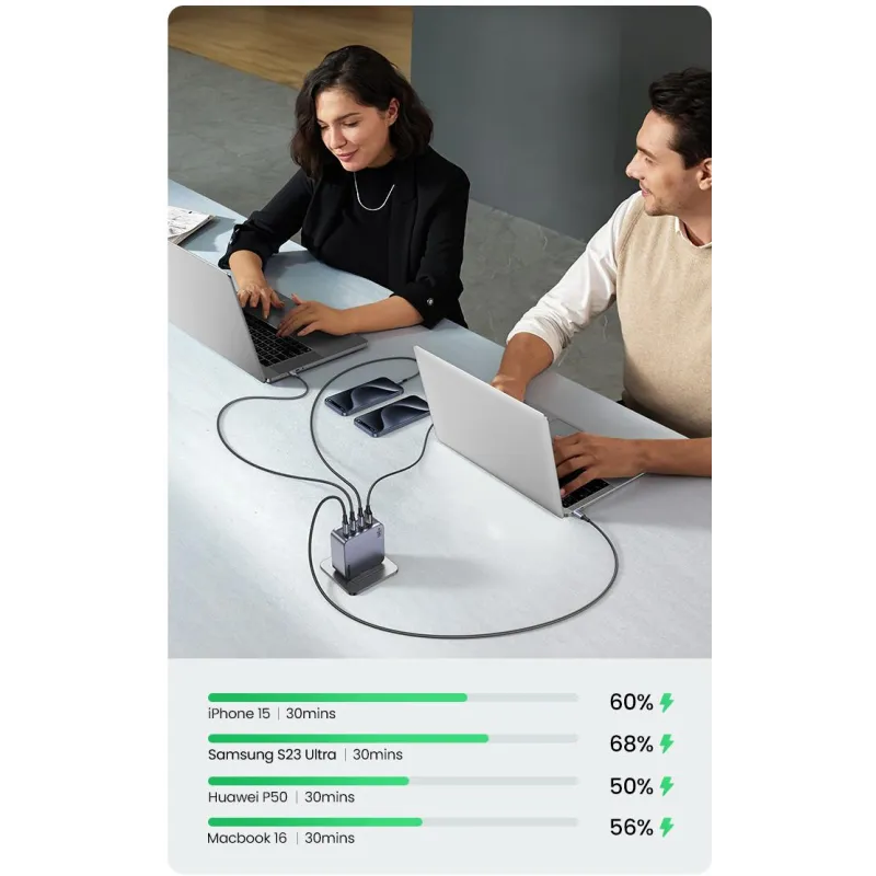 5. Varios dispositivos: conecta hasta 4 dispositivos y verifica que todos empiezan a cargar. El reparto de potencia entre puertos no está especificado, así que ajusta el orden si un equipo necesita más prioridad.