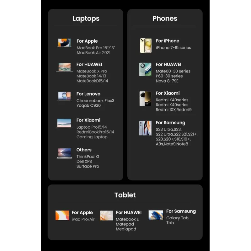 La compatibilidad se declara como universal. Para obtener carga rápida, el dispositivo debe ser compatible con USB Power Delivery. La lista exacta de modelos compatibles no está especificada.