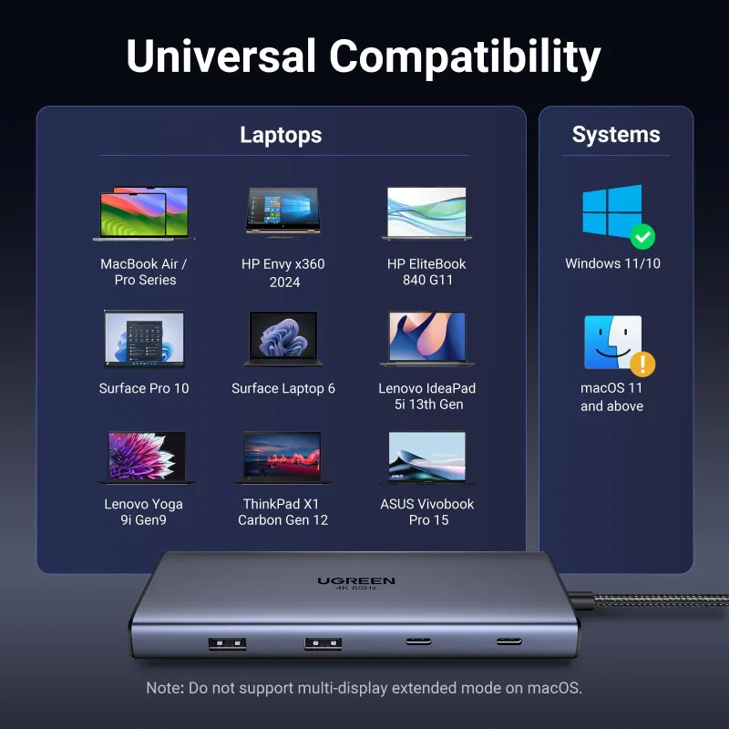 Que tu puerto USB-C del portátil soporte salida de vídeo (Alt Mode) si vas a usar los HDMI. Sin esa función, el dock sirve para USB, SD y Ethernet, pero no saca imagen.