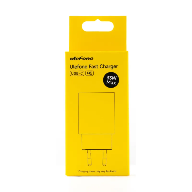 Cargador Smartphone Ulefone ULECHARGER33W con potencia 33W, carga rápida y conexión USB-C, diseño en color negro, compatible con múltiples dispositivos.