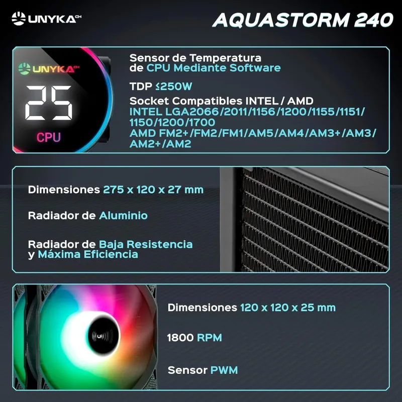 UNYKAch presenta su nueva refrigeración líquida AquaStorm 240, la solución perfecta para mantener los procesadores Intel y AMD en óptimas condiciones de temperatura. Con una bomba de alta calidad que alcanza los 2500 RPM, los usuarios podrán disfrutar de una refrigeración eficiente y silenciosa. Además, cuenta con un display que muestra la temperatura de la CPU en tiempo real, lo que permite a los usuarios tener un control absoluto sobre el rendimiento de su equipo.