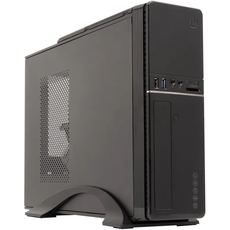 Este gabinete de PC en formato torre destaca por su material robusto SECC y SGCC, ofreciendo una estructura duradera y resistente. Su elegante color negro le da un toque sofisticado, ideal para cualquier configuración de escritorio. Compatible con tarjetas madre micro ATX, cuenta con una ranura de expansión de 4 bahías y admite hasta 3 tipos diferentes de discos duros (2.5", 3.5", 5.25").