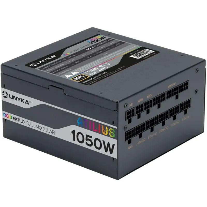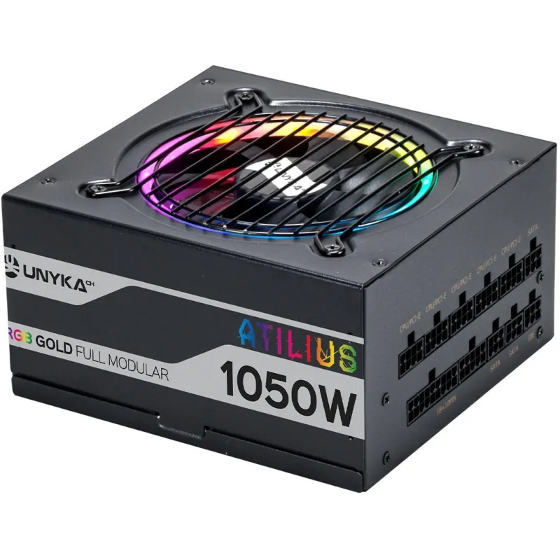 ¡LO QUE ESTABAS ESPERANDO!: UNYKAch amplia su serie ATILIUS a RGB con eficiencia del 90% GOLD full modular, se completa con fuentes de alimentación premium de 1050 vatios. Eficiencia constatada del 90%, un excelente ventilador RGB de 12 cm que permite el apagado de la luz si no lo necesitas, condensadores taiwaneses de alta calidad y cables modulares completos. Estos componentes colocan estos productos en el top de fuentes de alimentación de UNYKAch.