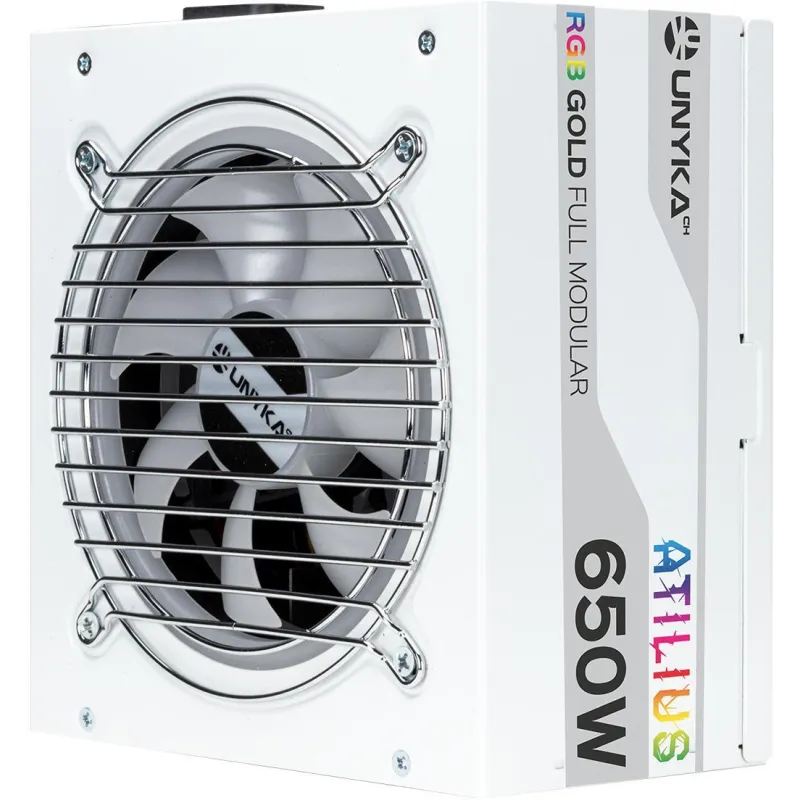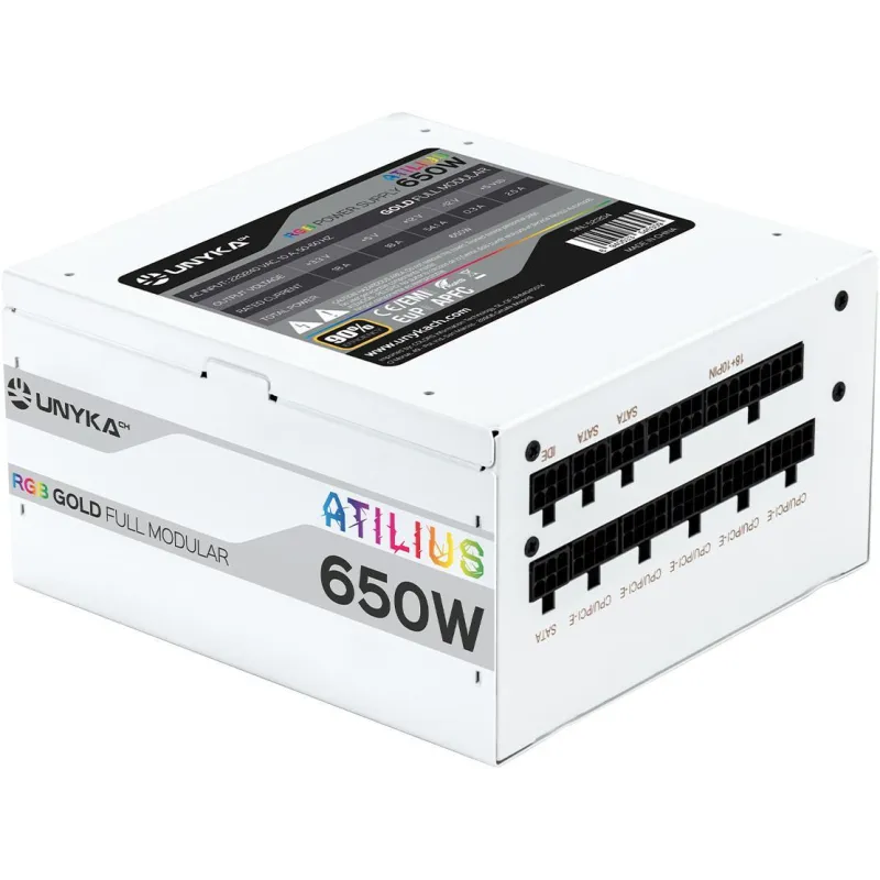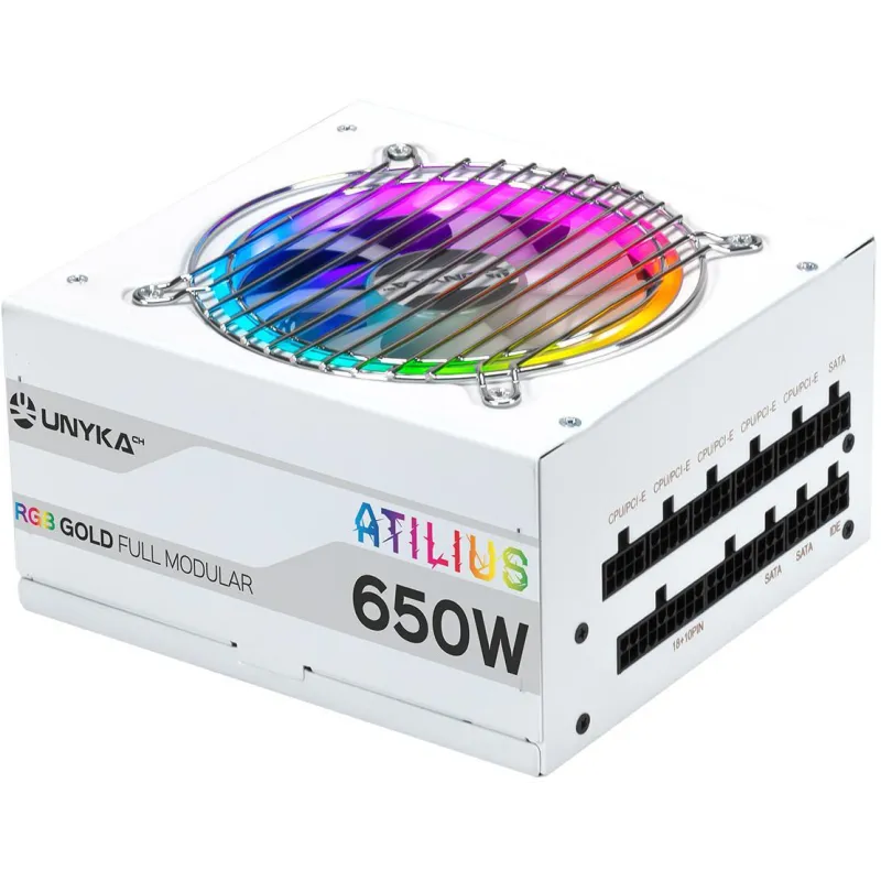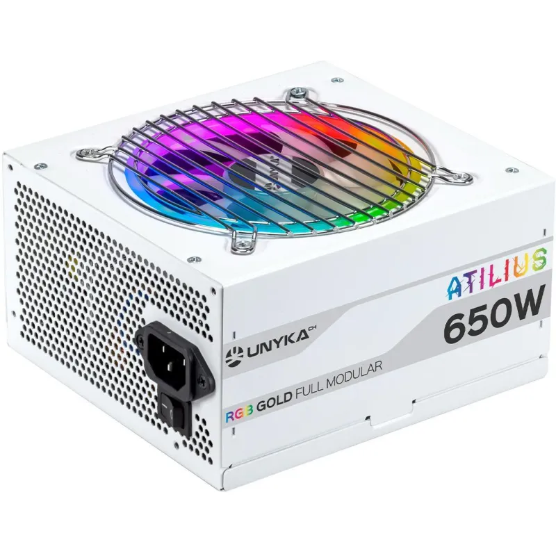¡LO QUE ESTABAS ESPERANDO! UNYKAch amplía su serie ATILIUS a RGB con eficiencia del 90% GOLD full modular, se completa con fuentes de alimentación premium de 650 vatios. Eficiencia constatada del 90%, un excelente ventilador RGB de 12 cm que permite el apagado de la luz si no lo necesitas, condensadores taiwaneses de alta calidad y cables modulares completos. Estos componentes colocan estos productos en el top de fuentes de alimentación de UNYKAch.