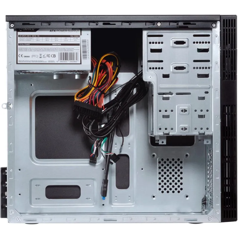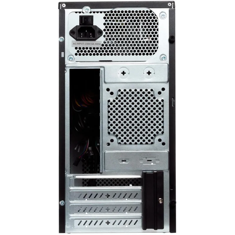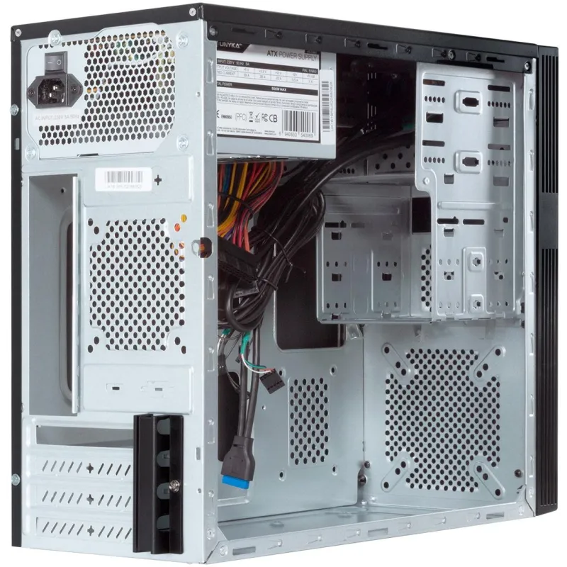 POTENCIA ASEGURADA: Incluye una fuente de alimentación de 500 W que se posiciona en la parte superior, brindando un flujo de energía constante y fiable. Este sistema cuenta con un solo número de fuentes de alimentación, compatible con factores de forma ATX, lo que asegura una instalación sencilla y una integración perfecta con los componentes del sistema. La configuración está diseñada para ofrecer la máxima eficiencia energética, garantizando un rendimiento óptimo en todo momento.