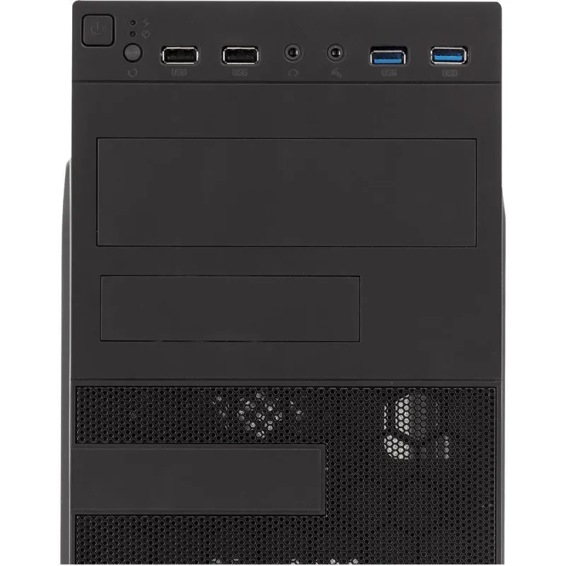 El chasis viene con una fuente de alimentación de 500 W incluida, compatible con factores de forma ATX. En términos de conectividad, ofrece 2 puertos USB 2.0 y 2 puertos tipo A USB 3.2 Gen 1 (3.1 Gen 1), además de entradas y salidas de audio, proporcionando todas las interfaces necesarias para un uso versátil.