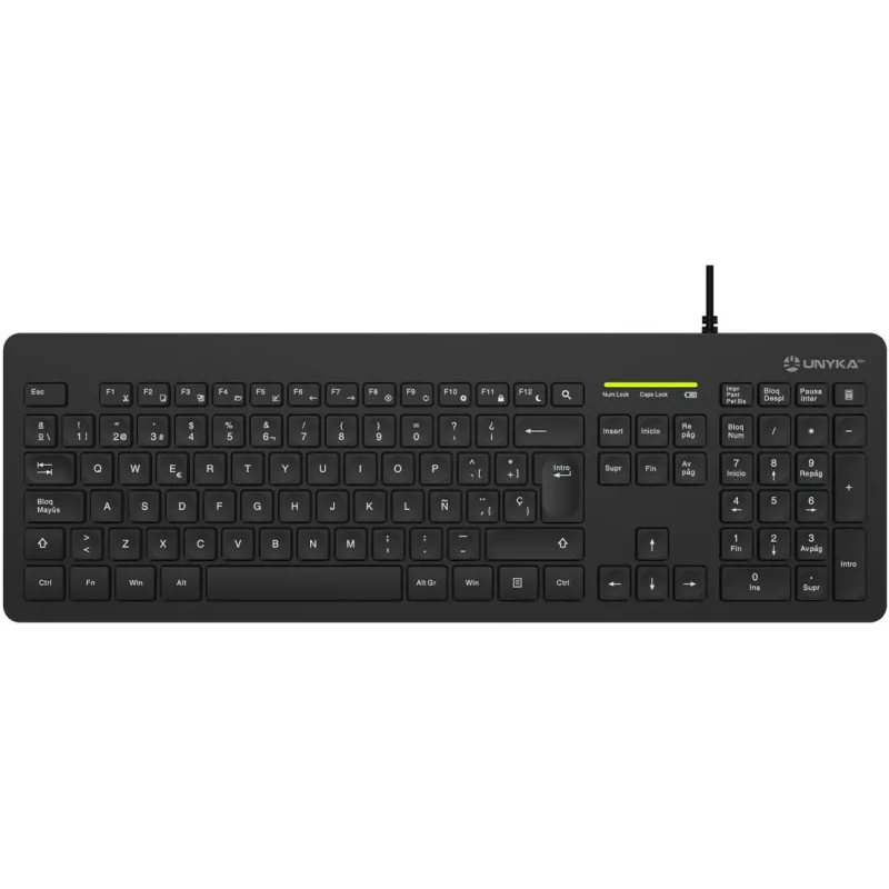 DISEÑO ERGONÓMICO Y RESISTENTE: Con un perfil bajo y sin retroiluminación, este teclado presenta un estilo sencillo y funcional. Fabricado en ABS sintéticos y color negro monocromo, su estructura robusta garantiza una larga duración. Además, cuenta con indicadores LED para notificaciones visuales del estado del teclado.