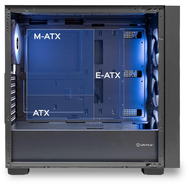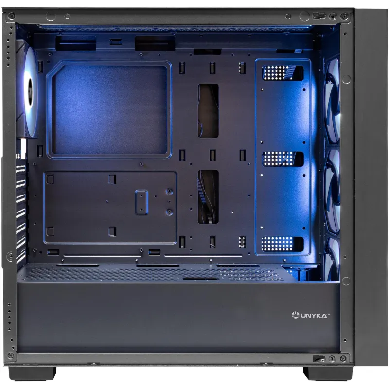 Con iluminación RGB integrada en sus ventiladores 120 mm, la Unykach Revelat MESH Black permite personalizar el aspecto de tu equipo según tus preferencias. Incluye un botón de control RGB que facilita el cambio de efectos de luz sin necesidad de software adicional. Esta funcionalidad no solo mejora la estética del sistema, sino que también permite adaptar el entorno visual a diferentes estilos o estados de uso. Combinado con su panel de vidrio templado, la iluminación RGB se convierte en un elemento clave para destacar el interior del equipo con un aspecto profesional y dinámico.