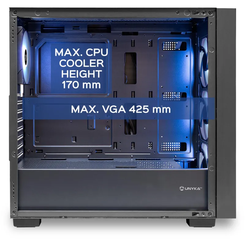 Esta Unykach Revelat MESH Black incluye 3 ventiladores 120 mm frontales y uno trasero, con soporte adicional para ventiladores superiores e inferiores, asegurando una refrigeración eficiente y silenciosa. El flujo de aire alcanza hasta 48,1 cfm con un nivel de ruido máximo de solo 27 dB. Su diseño permite instalar tarjetas gráficas de hasta 42,5 cm y disipadores de CPU de hasta 17 cm, lo que la convierte en una opción ideal para configuraciones de alto rendimiento. Además, el panel de vidrio templado añade un toque estético y funcional, facilitando la supervisión del hardware interno. Su conectividad es moderna, con puertos USB 3.2 tipo A y C, entrada y salida de audio, y compatibilidad con fuentes ATX ubicadas en la parte inferior, garantizando una distribución de cables limpia y eficiente.