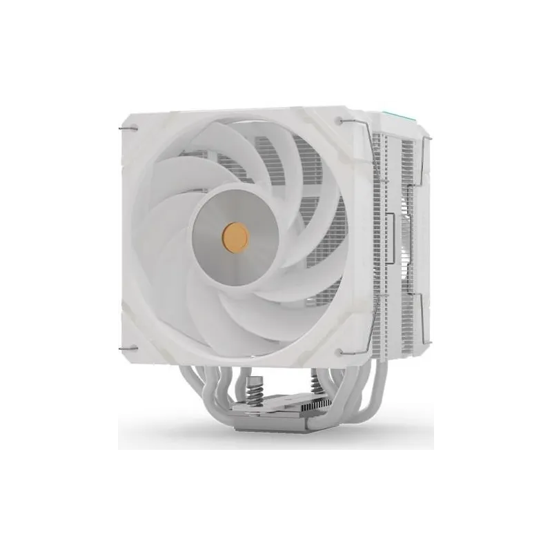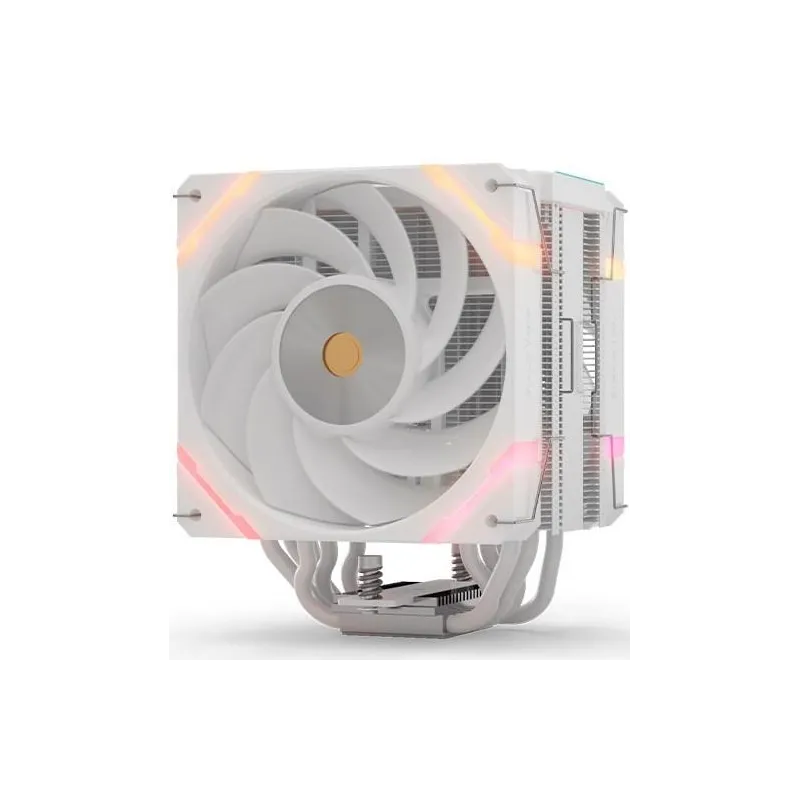El diseño elegante y moderno en color blanco se complementa con materiales de alta calidad: un radiador de aluminio y una base de placa de cobre, que mejoran la disipación del calor. Equipado con dos ventiladores, este refrigerador maximiza la refrigeración en un formato compacto y eficiente.
