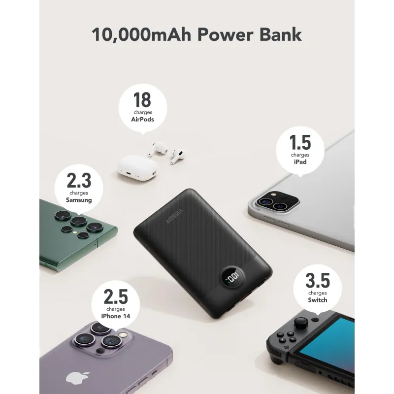 El PowerBank Veger C11 VG-W1170  se presenta con un formato cúbico y un peso de solo 165 gramos, lo que lo convierte en un compañero perfecto para quienes necesitan energía portátil sin sacrificar espacio. Fabricado en materiales resistentes como ABS y policarbonato, ofrece una excelente durabilidad frente al uso diario. Su pantalla LCD permite controlar en todo momento el estado de la batería, mientras que sus indicadores LED muestran información útil como el nivel de carga y la actividad del dispositivo. Gracias a su capacidad de carga simultánea de hasta tres dispositivos, es ideal para viajes, trabajo o actividades al aire libre. Además, su capacidad de batería 10000 mAh asegura una autonomía prolongada sin necesidad de recargar constantemente.