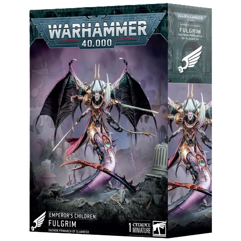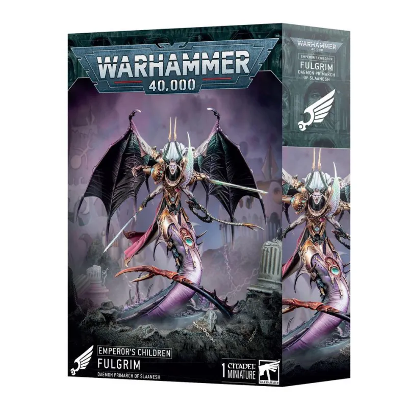 La miniatura representa a Fulgrim ya transformado en Primarca Daemon, con armadura barroca, alas imponentes y elementos orgánicos y demoníacos propios de Slaanesh. Es un kit de plástico multicomponente orientado a montadores y pintores experimentados, que permite trabajar capas, degradados y efectos de luz sobre superficies amplias y texturas muy variadas.