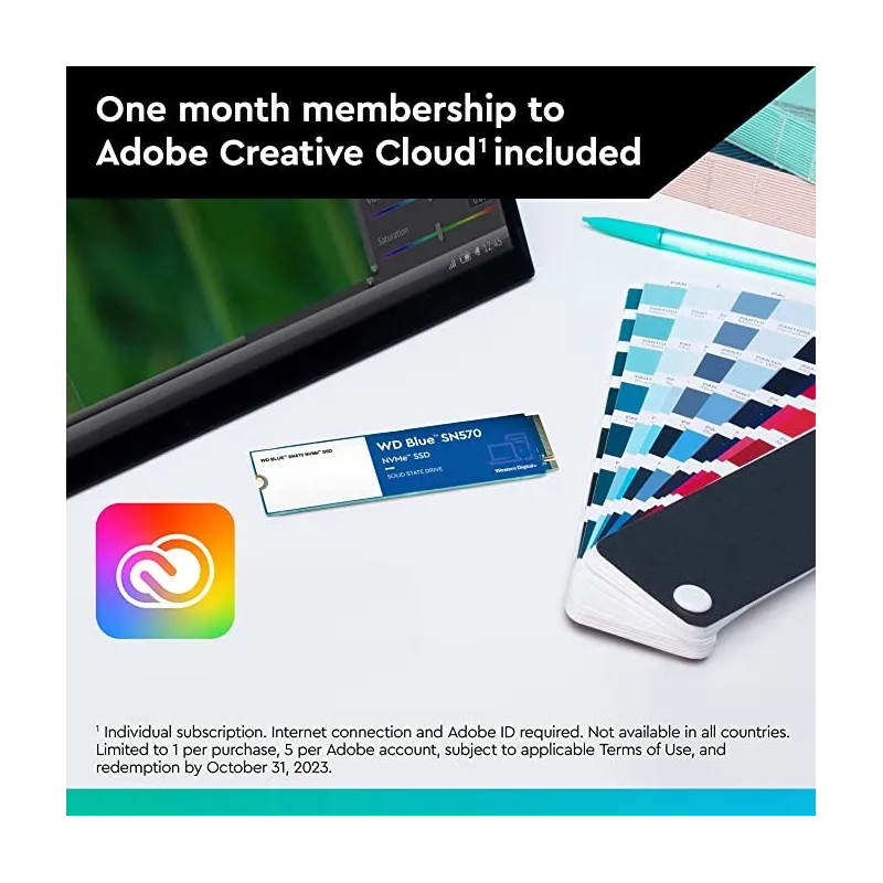 INSPIRA TU CREATIVIDAD: Permanezca en el momento y cree más allá de sus expectativas con el SSD WD Blue SN570 NVMe. Este potente disco interno ofrece hasta 5 veces la velocidad de nuestros mejores SSD SATA para que pueda dejar volar su imaginación y preocuparse menos por los retrasos o los tiempos de carga de la PC. Inspire la creatividad con una suscripción de un mes a Adobe Creative Cloud que ofrece acceso a algunas de las mejores aplicaciones y servicios creativos del mundo, como Adobe Photoshop, Illustrator, Lightroom, Premiere Pro e InDesign. 4