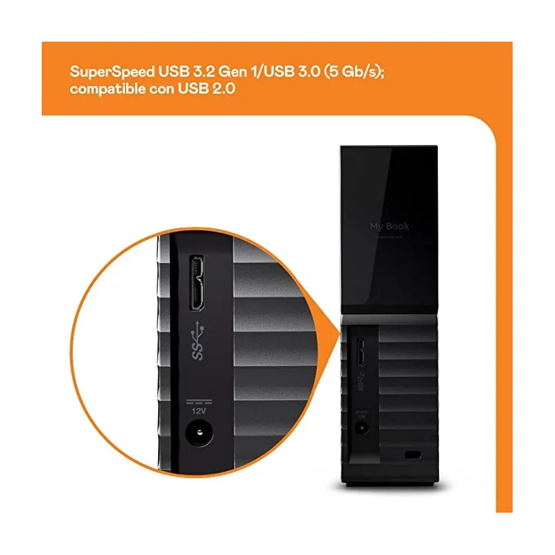 ALMACENA TODO LO QUE QUIERAS: Si eres de los que tienen miles de fotos, vídeos, música y documentos en tu ordenador, sabes lo importante que es tener un buen disco duro externo. Pero no te conformes con uno cualquiera, elige el que te ofrece más espacio, más velocidad y más seguridad: el disco duro externo de sobremesa WD My Book. Este disco duro tiene una capacidad de 12 TB, lo que equivale a unos 2400 millones de fotos o 6000 horas de vídeo. Con tanto espacio, podrás guardar todo lo que quieras sin preocuparte por quedarte sin memoria. Además, su interfaz USB 3.0 te permite transferir tus archivos con una velocidad de hasta 5 Gb/s, lo que significa que podrás copiar una película en HD en menos de un minuto.