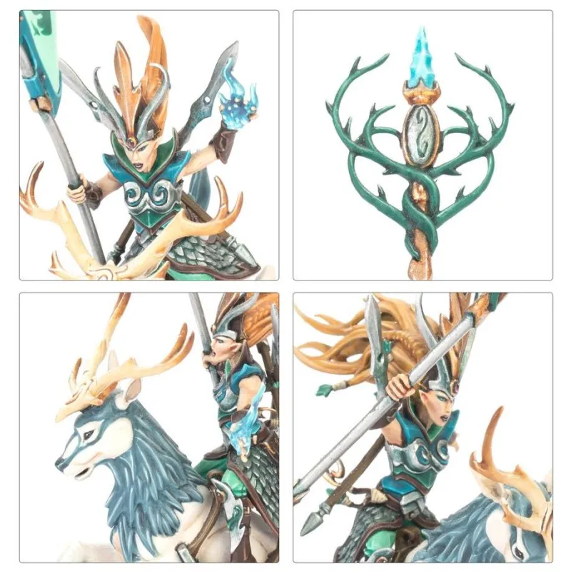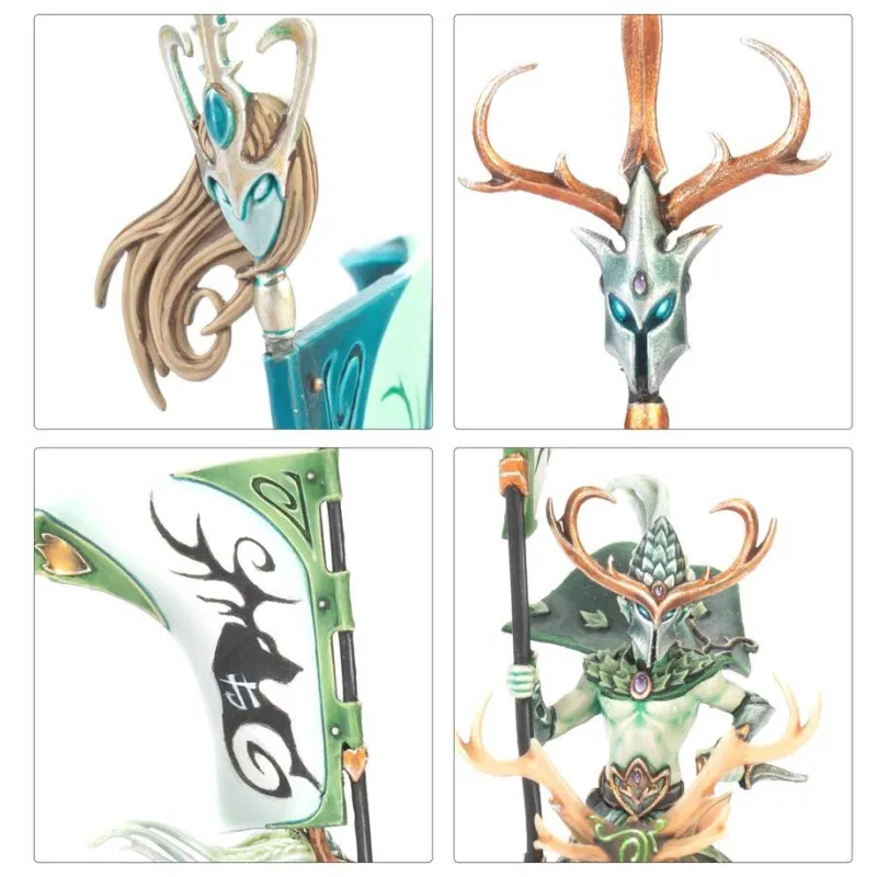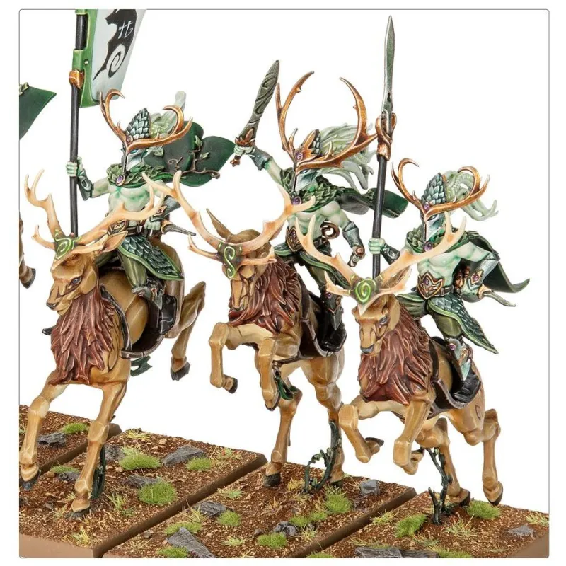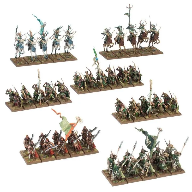 ESTE CONJUNTO EN CAJA CONSTRUYE UN NÚCLEO SÓLIDO DE UN EJÉRCITO DE LOS REINOS DE LOS ELFOS SILVANOS PARA USO EN JUEGOS DE WARHAMMER: The Old World: Jinetes Salvajes y Hermanas del Espino – caballería de élite – lideran la carga, mientras que los especialistas Guardabosques Salvajes y la Guardia Eterna armada con lanzas actúan como tropas de choque. Una unidad considerable de la Guardia del Claro armada con arcos largos Asrai apoya al resto del ejército.