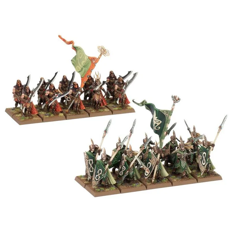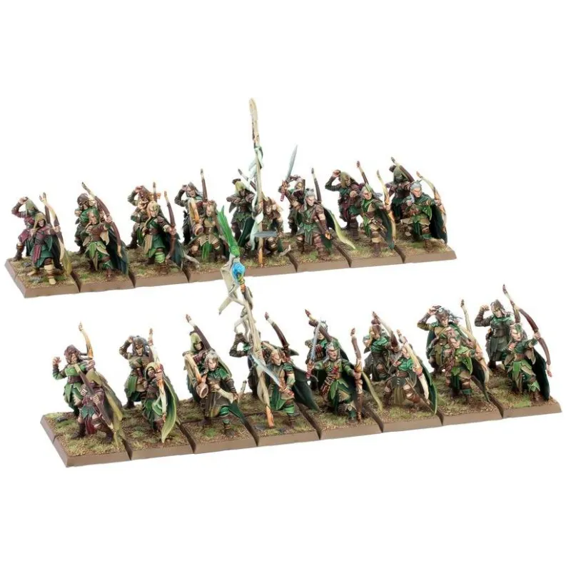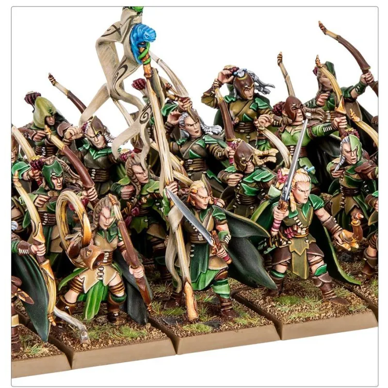 LOS EJÉRCITOS DE LOS REINOS DE LOS ELFOS SILVANOS SE LEVANTAN NATURALMENTE EN TIEMPOS DE CONFLICTO: Las tropas de amplio alcance convergen en la fuente del conflicto mientras el pueblo común toma sus arcos largos y lanzas para marchar bajo el estandarte de sus Señores del Claro. Incluso los guerreros más humildes poseen gracia y habilidad, lo que los convierte en un enemigo mortal al que enfrentarse.